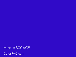 Hex #300ac8 Color is a normal indigo color and the nearest color is Interdimensional Blue #360ccc. Hex code #300ac8 and RGB value is rgb(48,10,200). In RGB color space, this color is composed of 19% red, 4% green, 78% blue, In CMYK color space, this color is composed of 76% cyan, 95% magenta, 0% yellow , 22% black , In HSL color space, this color has a hue angle of 252° , 90% saturation and 41% lightness.