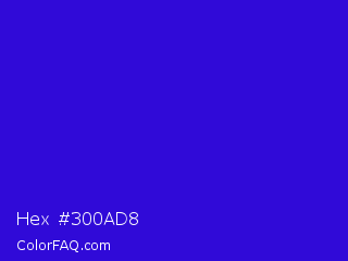Hex #300ad8 Color is a normal indigo color and the nearest color is Interdimensional Blue #360ccc. Hex code #300ad8 and RGB value is rgb(48,10,216). In RGB color space, this color is composed of 19% red, 4% green, 85% blue, In CMYK color space, this color is composed of 78% cyan, 95% magenta, 0% yellow , 15% black , In HSL color space, this color has a hue angle of 251° , 91% saturation and 44% lightness.