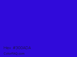 Hex #300ada Color is a normal indigo color and the nearest color is Interdimensional Blue #360ccc. Hex code #300ada and RGB value is rgb(48,10,218). In RGB color space, this color is composed of 19% red, 4% green, 85% blue, In CMYK color space, this color is composed of 78% cyan, 95% magenta, 0% yellow , 15% black , In HSL color space, this color has a hue angle of 251° , 91% saturation and 45% lightness.