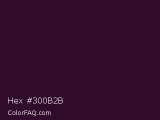 Hex #300b2b Color is a very dark magenta color and the nearest color is Melanzane #300529. Hex code #300b2b and RGB value is rgb(48,11,43). In RGB color space, this color is composed of 19% red, 4% green, 17% blue, In CMYK color space, this color is composed of 0% cyan, 77% magenta, 10% yellow , 81% black , In HSL color space, this color has a hue angle of 308° , 63% saturation and 12% lightness.