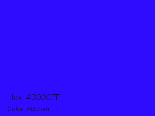 Hex #300cff Color is a normal indigo color and the nearest color is Electric Ultramarine #3f00ff. Hex code #300cff and RGB value is rgb(48,12,255). In RGB color space, this color is composed of 19% red, 5% green, 100% blue, In CMYK color space, this color is composed of 81% cyan, 95% magenta, 0% yellow , 0% black , In HSL color space, this color has a hue angle of 249° , 100% saturation and 52% lightness.