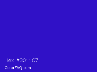 Hex #3011c7 Color is a normal indigo color and the nearest color is Interdimensional Blue #360ccc. Hex code #3011c7 and RGB value is rgb(48,17,199). In RGB color space, this color is composed of 19% red, 7% green, 78% blue, In CMYK color space, this color is composed of 76% cyan, 91% magenta, 0% yellow , 22% black , In HSL color space, this color has a hue angle of 250° , 84% saturation and 42% lightness.