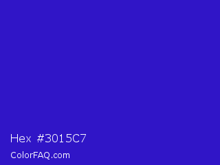 Hex #3015c7 Color is a normal indigo color and the nearest color is Interdimensional Blue #360ccc. Hex code #3015c7 and RGB value is rgb(48,21,199). In RGB color space, this color is composed of 19% red, 8% green, 78% blue, In CMYK color space, this color is composed of 76% cyan, 89% magenta, 0% yellow , 22% black , In HSL color space, this color has a hue angle of 249° , 81% saturation and 43% lightness.