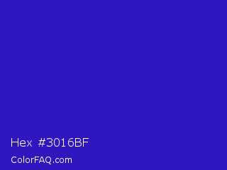Hex #3016bf Color is a normal indigo color and the nearest color is Interdimensional Blue #360ccc. Hex code #3016bf and RGB value is rgb(48,22,191). In RGB color space, this color is composed of 19% red, 9% green, 75% blue, In CMYK color space, this color is composed of 75% cyan, 88% magenta, 0% yellow , 25% black , In HSL color space, this color has a hue angle of 249° , 79% saturation and 42% lightness.