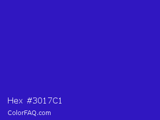 Hex #3017c1 Color is a normal indigo color and the nearest color is Interdimensional Blue #360ccc. Hex code #3017c1 and RGB value is rgb(48,23,193). In RGB color space, this color is composed of 19% red, 9% green, 76% blue, In CMYK color space, this color is composed of 75% cyan, 88% magenta, 0% yellow , 24% black , In HSL color space, this color has a hue angle of 249° , 79% saturation and 42% lightness.