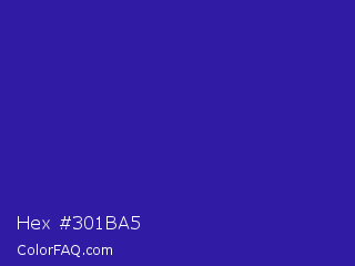 Hex #301ba5 Color is a normal indigo color and the nearest color is Blue Pigment #333399. Hex code #301ba5 and RGB value is rgb(48,27,165). In RGB color space, this color is composed of 19% red, 11% green, 65% blue, In CMYK color space, this color is composed of 71% cyan, 84% magenta, 0% yellow , 35% black , In HSL color space, this color has a hue angle of 249° , 72% saturation and 38% lightness.
