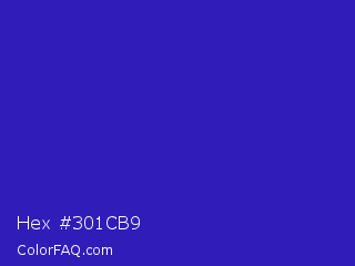 Hex #301cb9 Color is a normal indigo color and the nearest color is Interdimensional Blue #360ccc. Hex code #301cb9 and RGB value is rgb(48,28,185). In RGB color space, this color is composed of 19% red, 11% green, 73% blue, In CMYK color space, this color is composed of 74% cyan, 85% magenta, 0% yellow , 27% black , In HSL color space, this color has a hue angle of 248° , 74% saturation and 42% lightness.