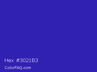Hex #3021b3 Color is a normal indigo color and the nearest color is Governor Bay #2f3cb3. Hex code #3021b3 and RGB value is rgb(48,33,179). In RGB color space, this color is composed of 19% red, 13% green, 70% blue, In CMYK color space, this color is composed of 73% cyan, 82% magenta, 0% yellow , 30% black , In HSL color space, this color has a hue angle of 246° , 69% saturation and 42% lightness.