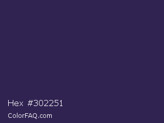 Hex #302251 Color is a dark indigo color and the nearest color is Valhalla #2b194f. Hex code #302251 and RGB value is rgb(48,34,81). In RGB color space, this color is composed of 19% red, 13% green, 32% blue, In CMYK color space, this color is composed of 41% cyan, 58% magenta, 0% yellow , 68% black , In HSL color space, this color has a hue angle of 258° , 41% saturation and 23% lightness.