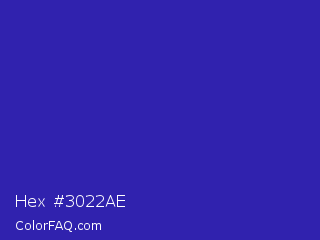 Hex #3022ae Color is a normal indigo color and the nearest color is Governor Bay #2f3cb3. Hex code #3022ae and RGB value is rgb(48,34,174). In RGB color space, this color is composed of 19% red, 13% green, 68% blue, In CMYK color space, this color is composed of 72% cyan, 80% magenta, 0% yellow , 32% black , In HSL color space, this color has a hue angle of 246° , 67% saturation and 41% lightness.