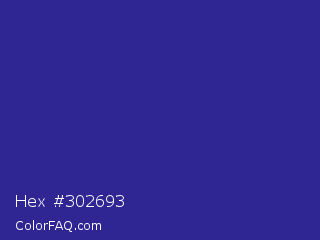 Hex #302693 Color is a normal indigo color and the nearest color is Cosmic Cobalt #2e2d88. Hex code #302693 and RGB value is rgb(48,38,147). In RGB color space, this color is composed of 19% red, 15% green, 58% blue, In CMYK color space, this color is composed of 67% cyan, 74% magenta, 0% yellow , 42% black , In HSL color space, this color has a hue angle of 246° , 59% saturation and 36% lightness.