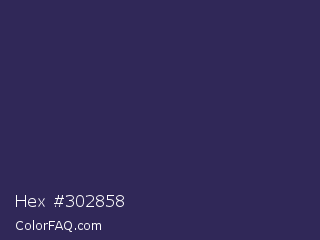 Hex #302858 Color is a dark indigo color and the nearest color is Martinique #363050. Hex code #302858 and RGB value is rgb(48,40,88). In RGB color space, this color is composed of 19% red, 16% green, 35% blue, In CMYK color space, this color is composed of 45% cyan, 55% magenta, 0% yellow , 65% black , In HSL color space, this color has a hue angle of 250° , 38% saturation and 25% lightness.