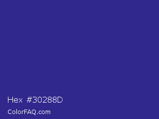Hex #30288d Color is a normal indigo color and the nearest color is Cosmic Cobalt #2e2d88. Hex code #30288d and RGB value is rgb(48,40,141). In RGB color space, this color is composed of 19% red, 16% green, 55% blue, In CMYK color space, this color is composed of 66% cyan, 72% magenta, 0% yellow , 45% black , In HSL color space, this color has a hue angle of 245° , 56% saturation and 35% lightness.