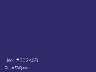 Hex #302a6b Color is a dark indigo color and the nearest color is Jacarta #3a2a6a. Hex code #302a6b and RGB value is rgb(48,42,107). In RGB color space, this color is composed of 19% red, 16% green, 42% blue, In CMYK color space, this color is composed of 55% cyan, 61% magenta, 0% yellow , 58% black , In HSL color space, this color has a hue angle of 246° , 44% saturation and 29% lightness.