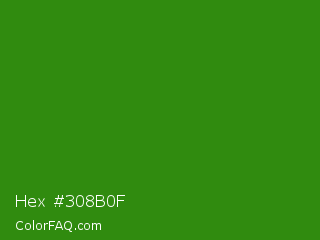 Hex #308b0f Color is a dark green color and the nearest color is La Palma #368716. Hex code #308b0f and RGB value is rgb(48,139,15). In RGB color space, this color is composed of 19% red, 55% green, 6% blue, In CMYK color space, this color is composed of 65% cyan, 0% magenta, 89% yellow , 45% black , In HSL color space, this color has a hue angle of 104° , 81% saturation and 30% lightness.