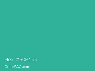 Hex #30b199 Color is a normal cyan color and the nearest color is Keppel #3ab09e. Hex code #30b199 and RGB value is rgb(48,177,153). In RGB color space, this color is composed of 19% red, 69% green, 60% blue, In CMYK color space, this color is composed of 73% cyan, 0% magenta, 14% yellow , 31% black , In HSL color space, this color has a hue angle of 169° , 57% saturation and 44% lightness.