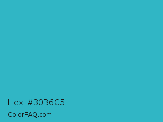 Hex #30b6c5 Color is a normal cyan color and the nearest color is Maximum Blue Green #30bfbf. Hex code #30b6c5 and RGB value is rgb(48,182,197). In RGB color space, this color is composed of 19% red, 71% green, 77% blue, In CMYK color space, this color is composed of 76% cyan, 8% magenta, 0% yellow , 23% black , In HSL color space, this color has a hue angle of 186° , 61% saturation and 48% lightness.