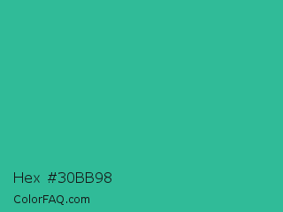 Hex #30bb98 Color is a normal cyan color and the nearest color is Mountain Meadow #30ba8f. Hex code #30bb98 and RGB value is rgb(48,187,152). In RGB color space, this color is composed of 19% red, 73% green, 60% blue, In CMYK color space, this color is composed of 74% cyan, 0% magenta, 19% yellow , 27% black , In HSL color space, this color has a hue angle of 165° , 59% saturation and 46% lightness.