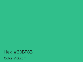 Hex #30bf8b Color is a normal green color and the nearest color is Mountain Meadow #30ba8f. Hex code #30bf8b and RGB value is rgb(48,191,139). In RGB color space, this color is composed of 19% red, 75% green, 55% blue, In CMYK color space, this color is composed of 75% cyan, 0% magenta, 27% yellow , 25% black , In HSL color space, this color has a hue angle of 158° , 60% saturation and 47% lightness.