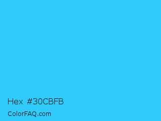 Hex #30cbfb Color is a normal blue color and the nearest color is Spiro Disco Ball #0fc0fc. Hex code #30cbfb and RGB value is rgb(48,203,251). In RGB color space, this color is composed of 19% red, 80% green, 98% blue, In CMYK color space, this color is composed of 81% cyan, 19% magenta, 0% yellow , 2% black , In HSL color space, this color has a hue angle of 194° , 96% saturation and 59% lightness.