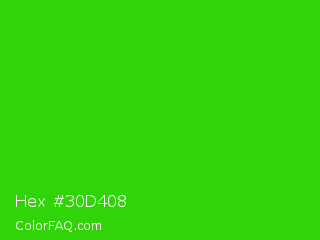 Hex #30d408 Color is a normal green color and the nearest color is Harlequin Green #46cb18. Hex code #30d408 and RGB value is rgb(48,212,8). In RGB color space, this color is composed of 19% red, 83% green, 3% blue, In CMYK color space, this color is composed of 77% cyan, 0% magenta, 96% yellow , 17% black , In HSL color space, this color has a hue angle of 108° , 93% saturation and 43% lightness.