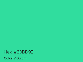 Hex #30dd9e Color is a normal green color and the nearest color is Shamrock #33cc99. Hex code #30dd9e and RGB value is rgb(48,221,158). In RGB color space, this color is composed of 19% red, 87% green, 62% blue, In CMYK color space, this color is composed of 78% cyan, 0% magenta, 29% yellow , 13% black , In HSL color space, this color has a hue angle of 158° , 72% saturation and 53% lightness.