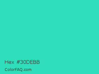 Hex #30debb Color is a normal cyan color and the nearest color is Turquoise PWG #30d5c8. Hex code #30debb and RGB value is rgb(48,222,187). In RGB color space, this color is composed of 19% red, 87% green, 73% blue, In CMYK color space, this color is composed of 78% cyan, 0% magenta, 16% yellow , 13% black , In HSL color space, this color has a hue angle of 168° , 73% saturation and 53% lightness.