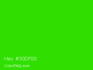 Hex #30df00 Color is a normal green color and the nearest color is Harlequin #3fff00. Hex code #30df00 and RGB value is rgb(48,223,0). In RGB color space, this color is composed of 19% red, 87% green, 0% blue, In CMYK color space, this color is composed of 78% cyan, 0% magenta, 100% yellow , 13% black , In HSL color space, this color has a hue angle of 107° , 100% saturation and 44% lightness.