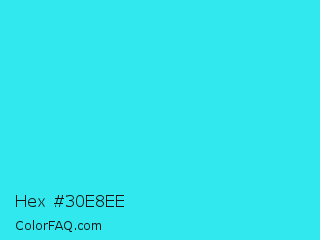 Hex #30e8ee Color is a normal cyan color and the nearest color is Loeen #15f2fd. Hex code #30e8ee and RGB value is rgb(48,232,238). In RGB color space, this color is composed of 19% red, 91% green, 93% blue, In CMYK color space, this color is composed of 80% cyan, 3% magenta, 0% yellow , 7% black , In HSL color space, this color has a hue angle of 182° , 85% saturation and 56% lightness.