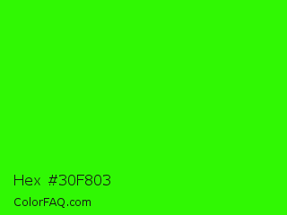 Hex #30f803 Color is a normal green color and the nearest color is Harlequin #3fff00. Hex code #30f803 and RGB value is rgb(48,248,3). In RGB color space, this color is composed of 19% red, 97% green, 1% blue, In CMYK color space, this color is composed of 81% cyan, 0% magenta, 99% yellow , 3% black , In HSL color space, this color has a hue angle of 109° , 98% saturation and 49% lightness.