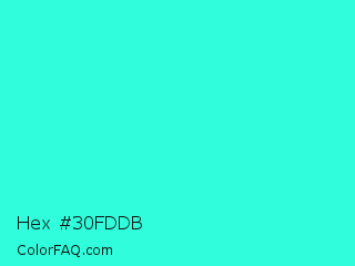Hex #30fddb Color is a normal cyan color and the nearest color is Turquoise #40e0d0. Hex code #30fddb and RGB value is rgb(48,253,219). In RGB color space, this color is composed of 19% red, 99% green, 86% blue, In CMYK color space, this color is composed of 81% cyan, 0% magenta, 13% yellow , 1% black , In HSL color space, this color has a hue angle of 170° , 98% saturation and 59% lightness.