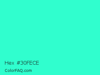 Hex #30fece Color is a normal cyan color and the nearest color is Turquoise #40e0d0. Hex code #30fece and RGB value is rgb(48,254,206). In RGB color space, this color is composed of 19% red, 100% green, 81% blue, In CMYK color space, this color is composed of 81% cyan, 0% magenta, 19% yellow , 0% black , In HSL color space, this color has a hue angle of 166° , 99% saturation and 59% lightness.