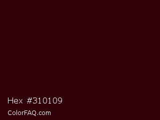 Hex #310109 Color is a very dark red color and the nearest color is Chocolate #370202. Hex code #310109 and RGB value is rgb(49,1,9). In RGB color space, this color is composed of 19% red, 0% green, 4% blue, In CMYK color space, this color is composed of 0% cyan, 98% magenta, 82% yellow , 81% black , In HSL color space, this color has a hue angle of 350° , 96% saturation and 10% lightness.