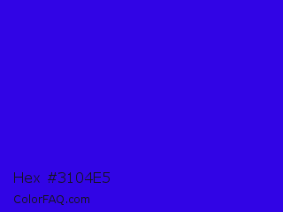 Hex #3104e5 Color is a normal indigo color and the nearest color is Interdimensional Blue #360ccc. Hex code #3104e5 and RGB value is rgb(49,4,229). In RGB color space, this color is composed of 19% red, 2% green, 90% blue, In CMYK color space, this color is composed of 79% cyan, 98% magenta, 0% yellow , 10% black , In HSL color space, this color has a hue angle of 252° , 97% saturation and 46% lightness.