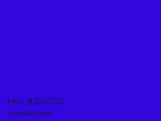 Hex #3107dc Color is a normal indigo color and the nearest color is Interdimensional Blue #360ccc. Hex code #3107dc and RGB value is rgb(49,7,220). In RGB color space, this color is composed of 19% red, 3% green, 86% blue, In CMYK color space, this color is composed of 78% cyan, 97% magenta, 0% yellow , 14% black , In HSL color space, this color has a hue angle of 252° , 94% saturation and 45% lightness.