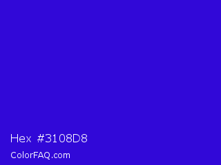 Hex #3108d8 Color is a normal indigo color and the nearest color is Interdimensional Blue #360ccc. Hex code #3108d8 and RGB value is rgb(49,8,216). In RGB color space, this color is composed of 19% red, 3% green, 85% blue, In CMYK color space, this color is composed of 77% cyan, 96% magenta, 0% yellow , 15% black , In HSL color space, this color has a hue angle of 252° , 93% saturation and 44% lightness.