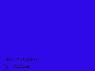Hex #3108e6 Color is a normal indigo color and the nearest color is Interdimensional Blue #360ccc. Hex code #3108e6 and RGB value is rgb(49,8,230). In RGB color space, this color is composed of 19% red, 3% green, 90% blue, In CMYK color space, this color is composed of 79% cyan, 97% magenta, 0% yellow , 10% black , In HSL color space, this color has a hue angle of 251° , 93% saturation and 47% lightness.