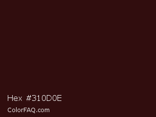 Hex #310d0e Color is a very dark red color and the nearest color is Coffee Bean #2a140e. Hex code #310d0e and RGB value is rgb(49,13,14). In RGB color space, this color is composed of 19% red, 5% green, 5% blue, In CMYK color space, this color is composed of 0% cyan, 73% magenta, 71% yellow , 81% black , In HSL color space, this color has a hue angle of 358° , 58% saturation and 12% lightness.