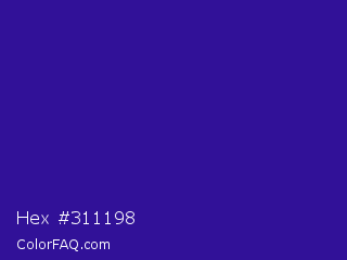 Hex #311198 Color is a normal indigo color and the nearest color is Blue Gem #2c0e8c. Hex code #311198 and RGB value is rgb(49,17,152). In RGB color space, this color is composed of 19% red, 7% green, 60% blue, In CMYK color space, this color is composed of 68% cyan, 89% magenta, 0% yellow , 40% black , In HSL color space, this color has a hue angle of 254° , 80% saturation and 33% lightness.