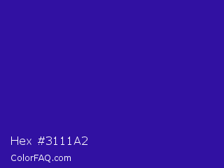 Hex #3111a2 Color is a normal indigo color and the nearest color is Blue Gem #2c0e8c. Hex code #3111a2 and RGB value is rgb(49,17,162). In RGB color space, this color is composed of 19% red, 7% green, 64% blue, In CMYK color space, this color is composed of 70% cyan, 90% magenta, 0% yellow , 36% black , In HSL color space, this color has a hue angle of 253° , 81% saturation and 35% lightness.