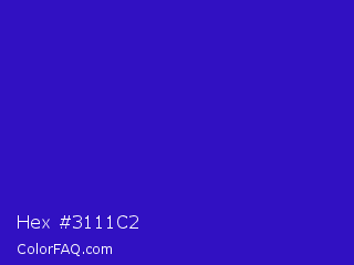 Hex #3111c2 Color is a normal indigo color and the nearest color is Interdimensional Blue #360ccc. Hex code #3111c2 and RGB value is rgb(49,17,194). In RGB color space, this color is composed of 19% red, 7% green, 76% blue, In CMYK color space, this color is composed of 75% cyan, 91% magenta, 0% yellow , 24% black , In HSL color space, this color has a hue angle of 251° , 84% saturation and 41% lightness.