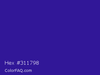 Hex #311798 Color is a normal indigo color and the nearest color is Blue Gem #2c0e8c. Hex code #311798 and RGB value is rgb(49,23,152). In RGB color space, this color is composed of 19% red, 9% green, 60% blue, In CMYK color space, this color is composed of 68% cyan, 85% magenta, 0% yellow , 40% black , In HSL color space, this color has a hue angle of 252° , 74% saturation and 34% lightness.