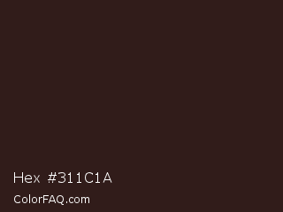 Hex #311c1a Color is a very dark red color and the nearest color is Eclipse #311c17. Hex code #311c1a and RGB value is rgb(49,28,26). In RGB color space, this color is composed of 19% red, 11% green, 10% blue, In CMYK color space, this color is composed of 0% cyan, 43% magenta, 47% yellow , 81% black , In HSL color space, this color has a hue angle of 5° , 31% saturation and 15% lightness.