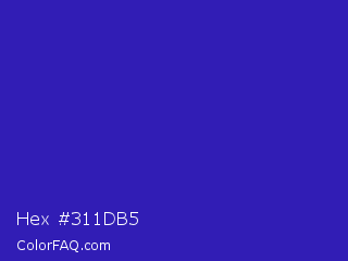 Hex #311db5 Color is a normal indigo color and the nearest color is Interdimensional Blue #360ccc. Hex code #311db5 and RGB value is rgb(49,29,181). In RGB color space, this color is composed of 19% red, 11% green, 71% blue, In CMYK color space, this color is composed of 73% cyan, 84% magenta, 0% yellow , 29% black , In HSL color space, this color has a hue angle of 248° , 72% saturation and 41% lightness.