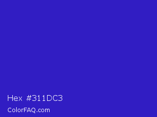 Hex #311dc3 Color is a normal indigo color and the nearest color is Interdimensional Blue #360ccc. Hex code #311dc3 and RGB value is rgb(49,29,195). In RGB color space, this color is composed of 19% red, 11% green, 76% blue, In CMYK color space, this color is composed of 75% cyan, 85% magenta, 0% yellow , 24% black , In HSL color space, this color has a hue angle of 247° , 74% saturation and 44% lightness.