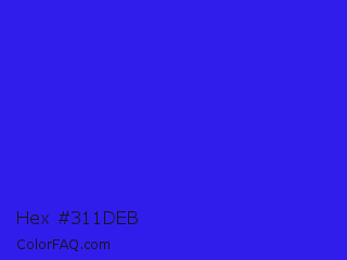 Hex #311deb Color is a normal indigo color and the nearest color is Bluebonnet #1c1cf0. Hex code #311deb and RGB value is rgb(49,29,235). In RGB color space, this color is composed of 19% red, 11% green, 92% blue, In CMYK color space, this color is composed of 79% cyan, 88% magenta, 0% yellow , 8% black , In HSL color space, this color has a hue angle of 246° , 84% saturation and 52% lightness.