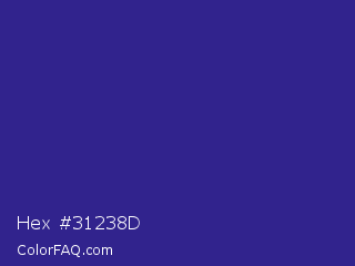 Hex #31238d Color is a normal indigo color and the nearest color is Cosmic Cobalt #2e2d88. Hex code #31238d and RGB value is rgb(49,35,141). In RGB color space, this color is composed of 19% red, 14% green, 55% blue, In CMYK color space, this color is composed of 65% cyan, 75% magenta, 0% yellow , 45% black , In HSL color space, this color has a hue angle of 248° , 60% saturation and 35% lightness.