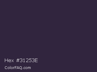 Hex #31253e Color is a very dark violet color and the nearest color is Blackcurrant #32293a. Hex code #31253e and RGB value is rgb(49,37,62). In RGB color space, this color is composed of 19% red, 15% green, 24% blue, In CMYK color space, this color is composed of 21% cyan, 40% magenta, 0% yellow , 76% black , In HSL color space, this color has a hue angle of 269° , 25% saturation and 19% lightness.