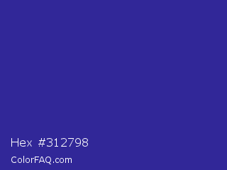 Hex #312798 Color is a normal indigo color and the nearest color is Blue Pigment #333399. Hex code #312798 and RGB value is rgb(49,39,152). In RGB color space, this color is composed of 19% red, 15% green, 60% blue, In CMYK color space, this color is composed of 68% cyan, 74% magenta, 0% yellow , 40% black , In HSL color space, this color has a hue angle of 245° , 59% saturation and 37% lightness.