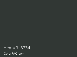 Hex #313734 Color is a very dark green color and the nearest color is Jet #343434. Hex code #313734 and RGB value is rgb(49,55,52). In RGB color space, this color is composed of 19% red, 22% green, 20% blue, In CMYK color space, this color is composed of 11% cyan, 0% magenta, 5% yellow , 78% black , In HSL color space, this color has a hue angle of 150° , 6% saturation and 20% lightness.